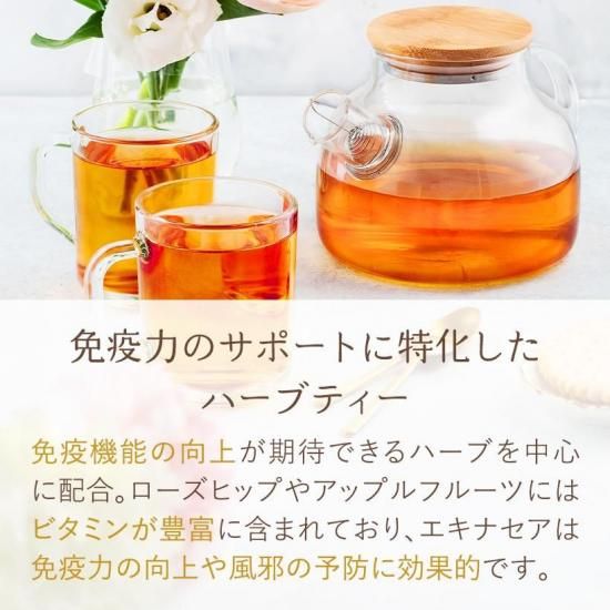 免疫機能の向上が期待できるハーブを中心に配合した、風邪を引きやすい方にはぜひ飲んでいただきたいハーブティーです。ローズヒップやアップルフルーツにはビタミンが豊富に含まれており、エキナセアは免疫力の向上や風邪の予防に効果的と言われています。風邪の予防対策のひとつとして、ハーブティーを取り入れてみてはいかがでしょうか。