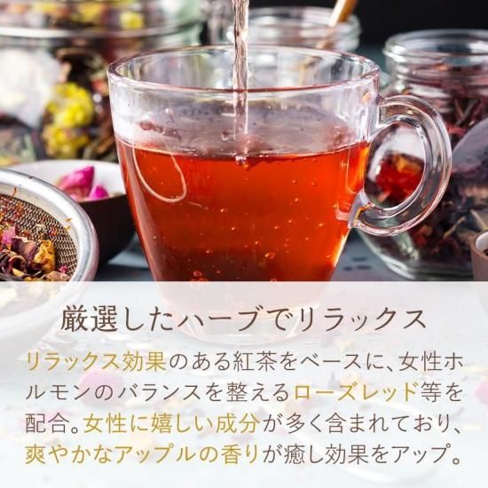 忙しい女性がほっと一息つけるように、リラックス効果の高いハーブを厳選しました。リラックス効果のある紅茶をベースに、女性ホルモンのバランスを整えてくれるローズレッド等を配合。女性に嬉しい成分が多く含まれており、爽やかなアップルの香りがさらに癒し効果を高めてくれます。