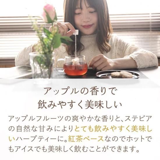 アップルフルーツの爽やかな香りと、ステビアの自然な甘みによりとても飲みやすく美味しいハーブティーに仕上げました。ステビアは砂糖に比べてカロリーや糖質が大幅に少ないため、血糖値が気になる方も安心してお召し上がりいただけます。紅茶ベースなのでホットでもアイスでも美味しく飲むことができ、ハーブティーが苦手な方や、季節を選ばないハーブティーとして大変ご好評いただいております。