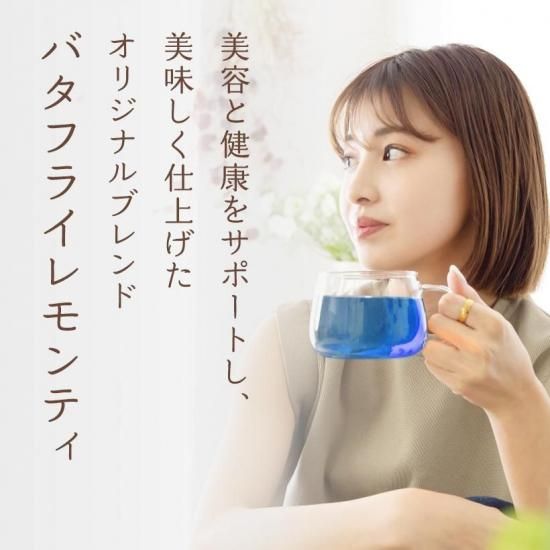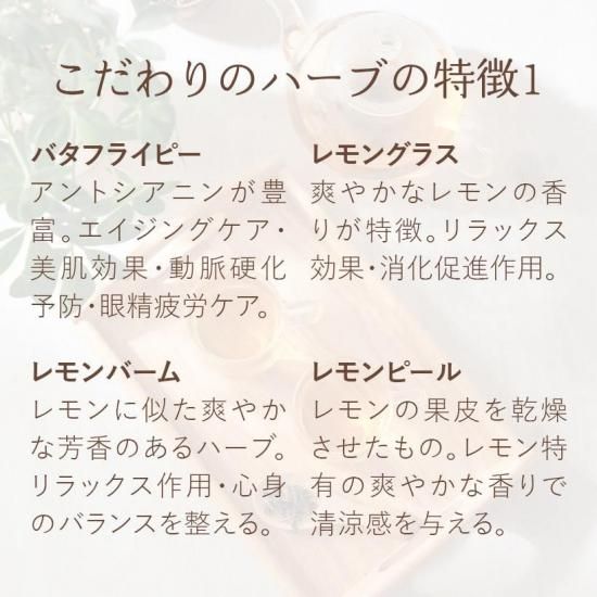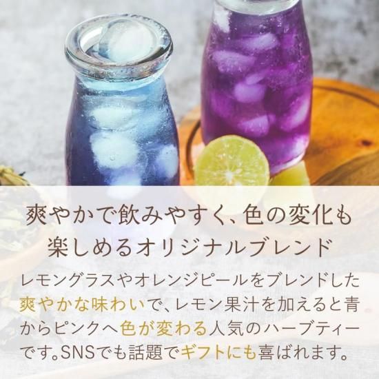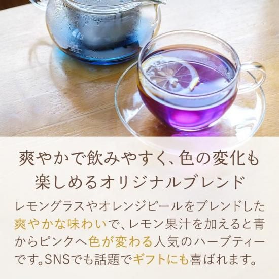 当店のバタフライピーは、レモングラスやオレンジピールなどをブレンドし、爽やかで飲みやすい味わいに仕上げています。また、バタフライピーはレモン果汁を加えることで、青からピンクへと色が鮮やかに変化するので、視覚的にも楽しめるハーブティーとして大変人気を集めています。SNSでも話題のハーブティーなので、プレゼントとしても喜ばれています。