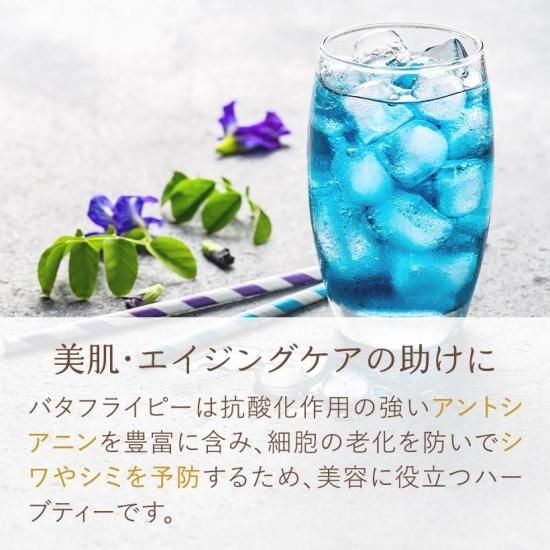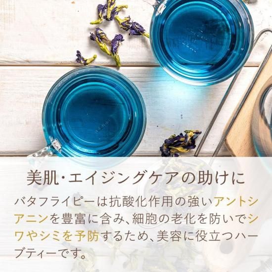 バタフライピーには、抗酸化作用の強い「アントシアニン」が豊富に含まれており、エイジングケアの助けになります。抗酸化作用は細胞の老化を防ぎ、シワやシミの予防に効果があるとされているので、美容に関心のある方に飲んでいただきたいハーブティーです。