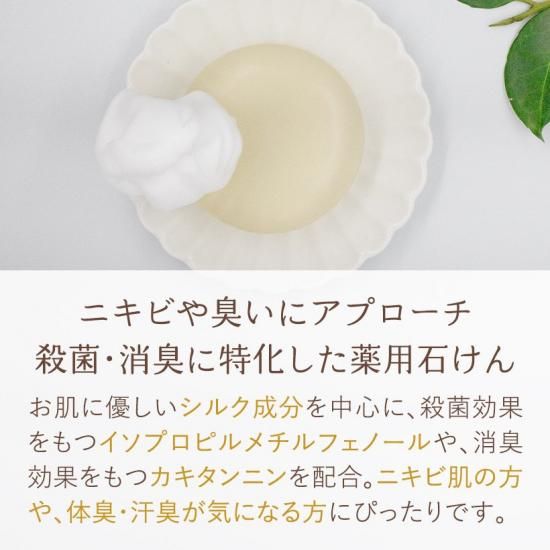 お肌に優しいシルク成分を中心に、殺菌効果をもつイソプロピルメチルフェノールや、消臭効果をもつ自然由来成分のカキタンニンを配合。ニキビ肌に効果があり、体臭や汗臭が気になる方にぴったりの薬用石けんです。