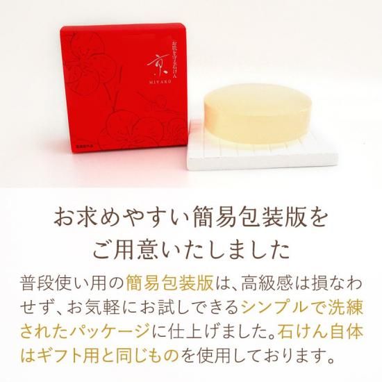 「石けんは使ってみたいけど、個人で使うにはちょっと高いかも…」そんなお客様のご要望にお応えして、普段使い用の簡易包装版をご用意いたしました。高級感は損なわせず、お気軽にお試しいただけるようシンプルで洗練されたパッケージに仕上げました。もちろん石けん自体はギフト用と同じものを使用しております。普段使いをお考えの方は、ぜひ当商品をお買い求めください。